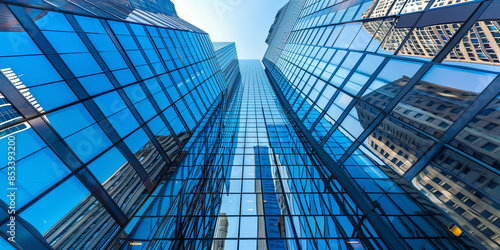 a modern skyscraper with blue glass windows reflecting other buildings, generative AI