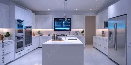 A modern, sleek kitchen featuring white cabinetry, stainless steel appliances, an island, and smart technology integrated into the design.
