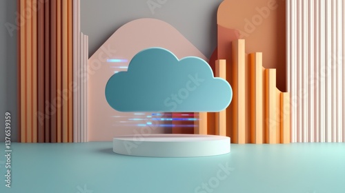A modern, stylized representation of a cloud above a platform, surrounded by abstract shapes in pastel colors, symbolizing digital technology or cloud computing.