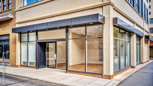 A modern vacant storefront with a bright "For Lease" sign prominently displayed in the window, surrounded by neutral-colored walls and a clean sidewalk exterior.