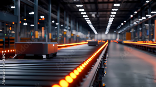 A modern warehouse scene featuring a conveyor belt with automated robots transporting goods, illuminated by bright overhead lights.