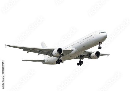 A modern white passenger airplane in flight, isolated on a transparent background