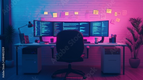 A modern workspace featuring multiple monitors, a chair, and colorful sticky notes on a wall, illuminated in pink and blue hues.
