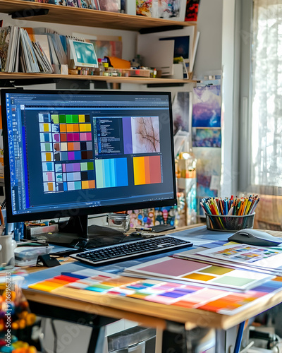 A modern workspace with a computer monitor displaying a color palette and a variety of design materials on the desk.