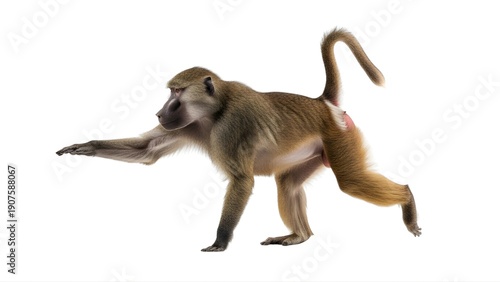 A monkey standing on its hind legs with one arm outstretched on transparent background