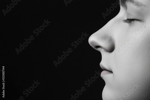 A monochrome profile of a person with closed eyes, conveying a sense of calm and introspection against a dark background.