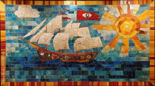 A mosaic artwork celebrating Columbus’s voyage, abstract geometric patterns, bright colors, and historic imagery combined"