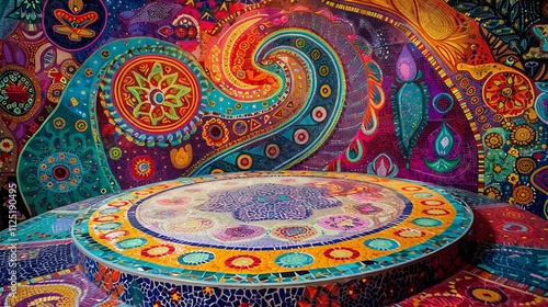 A mosaic podium featuring an intricate paisley pattern in bright, contrasting colors, set in a vibrant, artistic environment