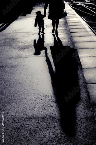 A mother and child are walking on a platform, holding hands. The shadows of the two are cast on the ground.