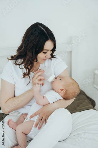 a mother feeds a baby from a bottle, a happy young mother feeds a newborn baby with milk or formula and smiles on the bed at home, a loving family holds their son in their arms. baby food