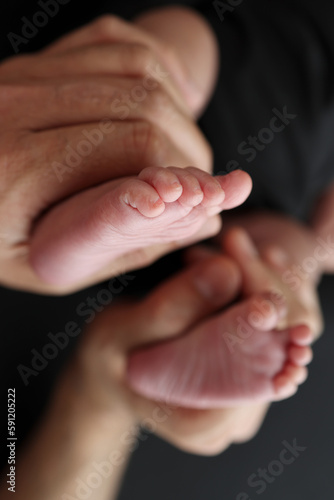 A mother hold the feet of a newborn child in a black blanket on a Black background. The feet of a newborn in the hands of parents. Studio macro photo legs, toes, feet and heels of a newborn.