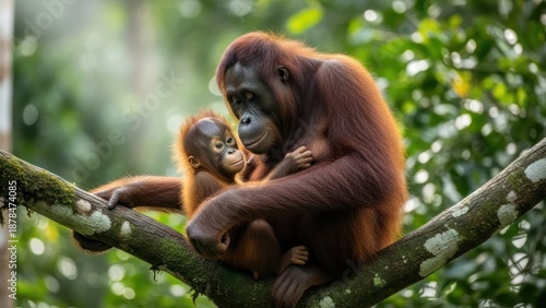 A mother orangutan and her baby sitting together on a tree branch in a lush forest with green