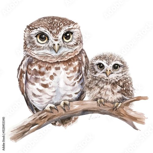 A Mother Owl With Her Kid, watercolor painting vector, high quality, isolated on a white background.