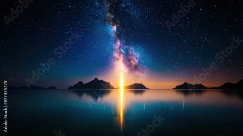 A motionless body of water reflects a light pillar, and the Milky Way is visible in the distance.