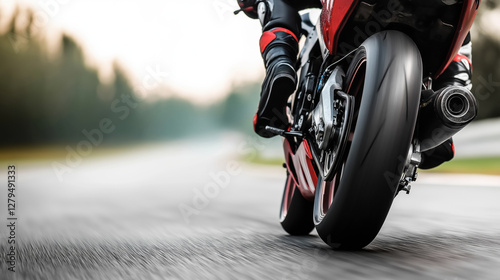 A motorcycle is on a road with a person on it. The motorcycle is red and black. The person is wearing a black helmet and red gloves. The motorcycle is moving fast