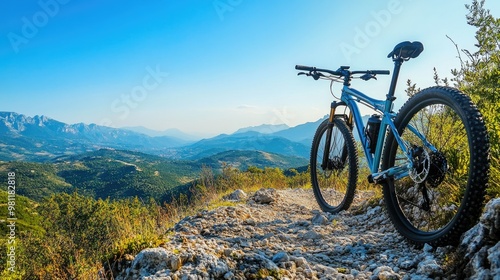 A mountain bike resting against a rocky trail, with the background of a scenic mountain landscape and clear blue sky.