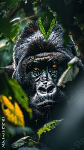 A mountain gorilla gazes intently from behind a curtain of green leaves