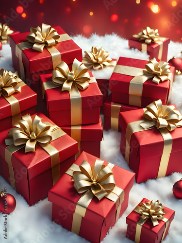 A Mountain of Festive Cheer: Red and Green gift boxes adorned with golden bows, evoking the warmth and joy of the holiday season.