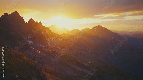 A mountain range bathed in the golden light of dawn, the peaks representing the grand visions of a creative mind.