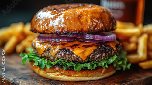 A mouthwatering cheeseburger topped with fresh lettuce and onion, accompanied by golden fries, presented in a cozy dining atmosphere