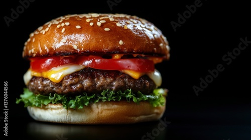A mouthwatering hamburger in dramatic lighting against a sleek black background, highlighting rich textures, juicy layers, and gourmet appeal
