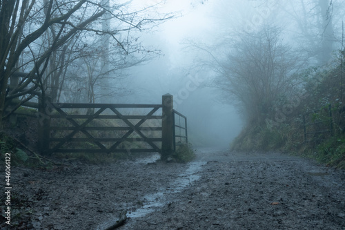 A muddy path, next to a gate, through a foggy, eerie, winters forest.