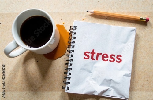 A mug with spilled coffee, a notepad with the inscription stress and a pencil on a light background