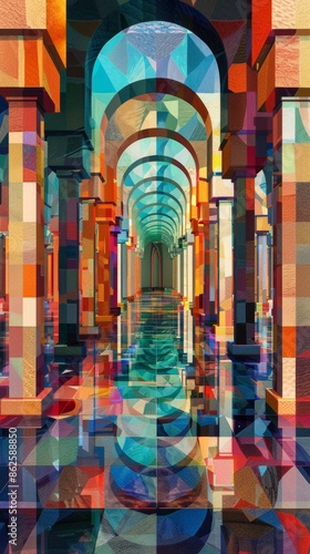 A multicolored mosaic of geometric pillars creating an optical illusion of depth and dimension.