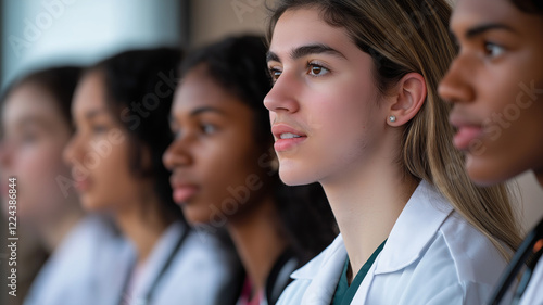 A multicultural group of young medical students attentively listening in a lecture room setting