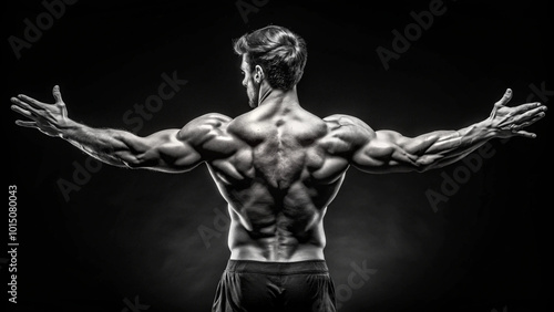 a muscular male figure standing centered in the frame with arms outstretched, revealing prominent muscle definition and contours.