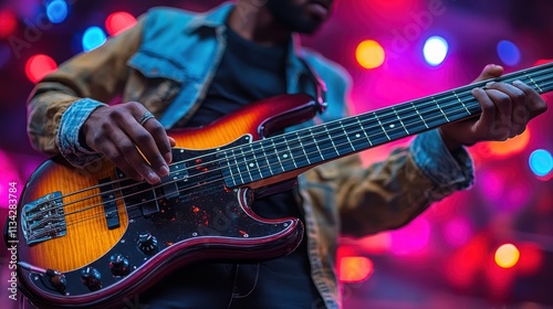 A musician playing a bass guitar on stage with vibrant lights in the background.