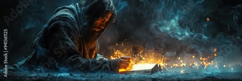 A mysterious figure studying an ancient book by a flickering ember in an enchanted forest at twilight. Generative AI