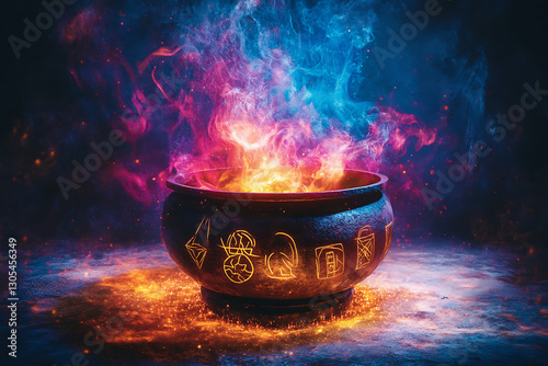 A mystical cauldron glowing with vibrant magical energy, emitting swirling pink, orange, and blue flames.
