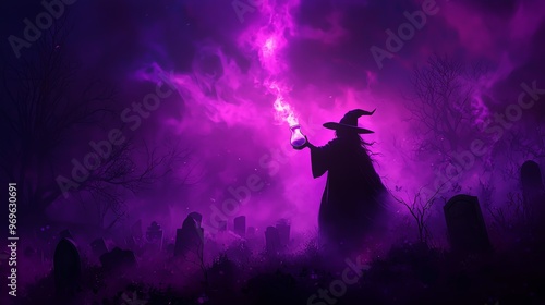 A mystical witch cast spells in a dark, foggy graveyard, illuminated by purple magic. Perfect for Halloween-themed designs.
