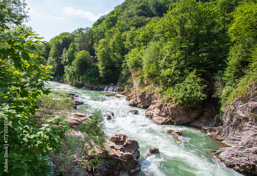A narrow gorge through which a river flows, the sun's rays break through the foliage