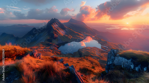 A nature mountain during sunset, the sky ablaze with colors, and the mountains casting long shadows