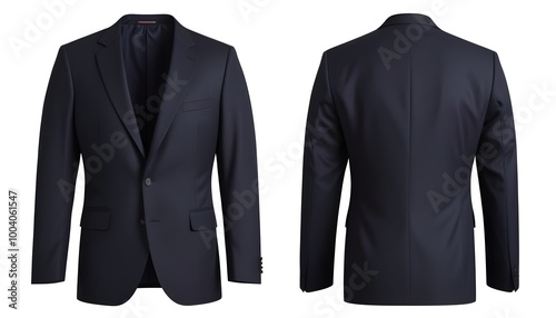 A navy blue suit jacket with a peak lapel and single-breasted closure