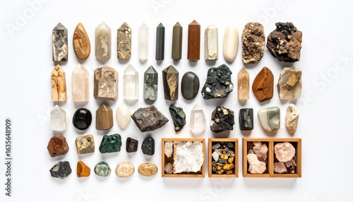 A neatly arranged wooden display case filled with diverse mineral and rock specimens, each occupying its own compartment—celebrating geological variety, natural beauty, and the quiet order of collecti