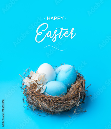 A nest with colored Easter eggs on a blue background.