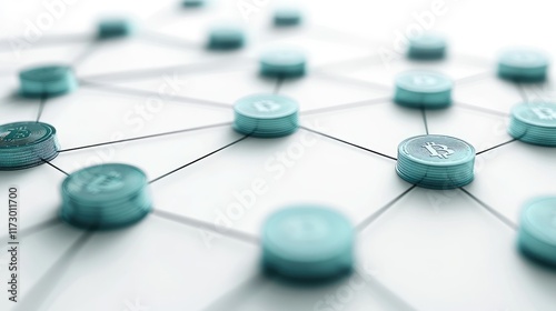 A network graph of interconnected coins, blockchain and finance theme, sleek futuristic style, isolated on white background