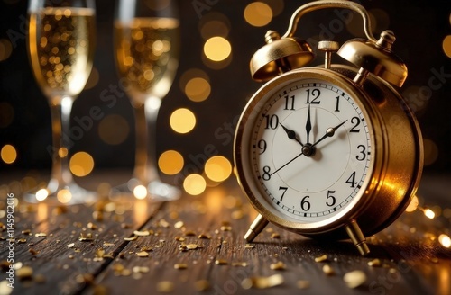 A New Year countdown scene featuring a vintage golden clock, surrounded by sparkling confetti, champagne glasses, and a blank card for personalized text