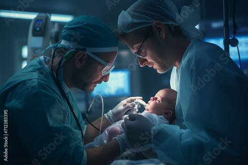 A newborn baby is examined by a doctor or nurse in the hospital