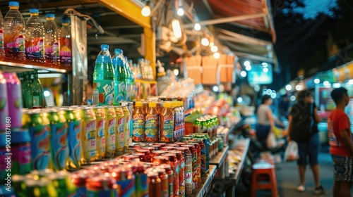 A night market in Asia, with a focus on stalls selling a variety of canned drinks