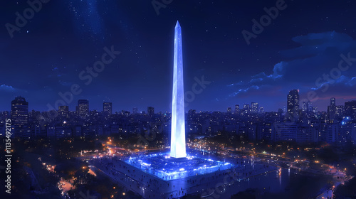 A nighttime view of buenos aires, with the obelisk of buenos aires illuminated and the city alive with lights. Obelisk. Illustration