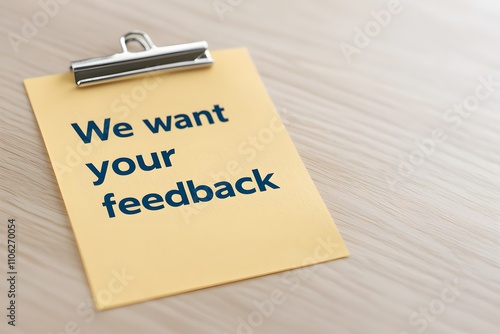 A note with ‘We want your feedback’ written on it, symbolising the importance of customer opinions and engagement for improvement and growth