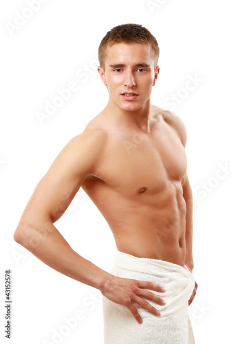 A nude young man covering himself with a towel