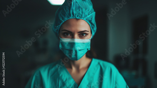 A nurse wearing scrubs and a surgical mask with an intense, focused expression in a dimly lit hospital environment.
