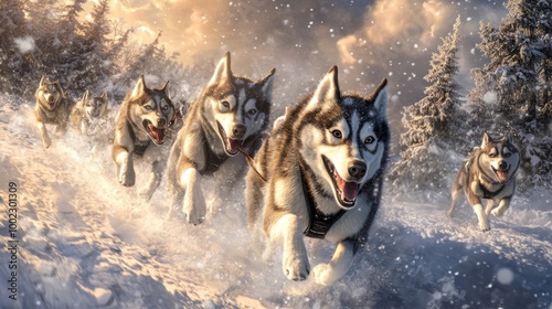 A Pack of Siberian Huskies Running Through a Snowy Forest