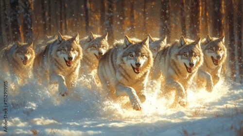 A pack of wolves running through a snowy forest, illuminated by warm light.
