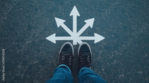 A pair of black sneakers stands on a pavement adorned with white arrows pointing in multiple directions, symbolizing choices and the power of decision-making in an urban environment.